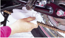 Для поддержания в хорошем состоянии обслуживание цепи необходимо каждые 500-650км. Все O-Ring и X-Ring цепи нуждаются в промывке и смазке. С завода сальниковые цепи O-Ring и X-Ring имеют специально разработанную смазку D.I.D, которая находится между втулками и сальниками. Смазывать необходимо как внутренние части звеньев с роликами, так внешние для защиты от коррозии и для увеличения срока службы сальников как O-Ring так и X-Ring. Никогда не используйте летучие раствортели для очистки цепей и ни в коем случае не замачивайте цепь в жидкости для очистки цепи! Данные действия приведут к повреждениям сальников и резко сократят срок службы. При нормальном обслуживании цепи O-Ring служат 16 000 км, цепи X-Ring нужно менять каждые 32 000 км. Очистка цепи  | Итак, что же нам понадобится для обслуживания цепи, - очиститель цепи, мягкая салфетка, лоток (только для безсальниковых цепей мягкая кисточка) |  | Перед началом очистки цепи установите мотоцикл на подкат или на центральную подножку так, чтобы можно было прокручивать заднее колесо. Поставьте лоток под цепь, одной рукой держите салфетку под цепью - так брызги очистителя не будут сильно разлетаться, второй распыляйте очиститель на цепь и прокручивайте колесо пока цепь не будет полностью отмыта. |  | Только безсальниковые цепи можно очищать от грязи с помощьюмягкой кисточки. Используя даже мягкую кисть для очистки O-Ring и X-Ring цепей можно повредить сальники. Жесткие металлические щетки запрещено использовать для чистки любых видов цепей D.I.D |  | После промывки цепи протрите её мягкой салфеткой для удаления остатков очистителя и грязи. |  | Смазка цепи  | Для смазки цепи нам потребуются: смазка для цепи, мягкая салфетка и лоток. |  |  | Взболтайте смазку для цепи как указано в инструкции. Данная операция необходима для смешивания компонентов смазки каждый раз перед использованием. |  | Перед смазкой поместите лоток под цепь. Держите салфетку одной рукой, другой распыляйте смазку на расстоянии 3-6 см от звеньев. Прокручивайте колесо пока вся цепь не будет смазана. |  | Протрите цепь мягкой салфеткой для удаления излишков смазки. | Обслуженная цепь D.I.D не подведет даже в самой экстримальной ситуации!
